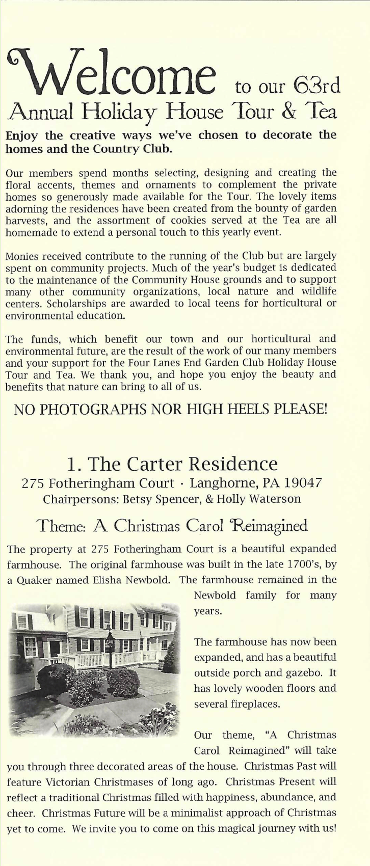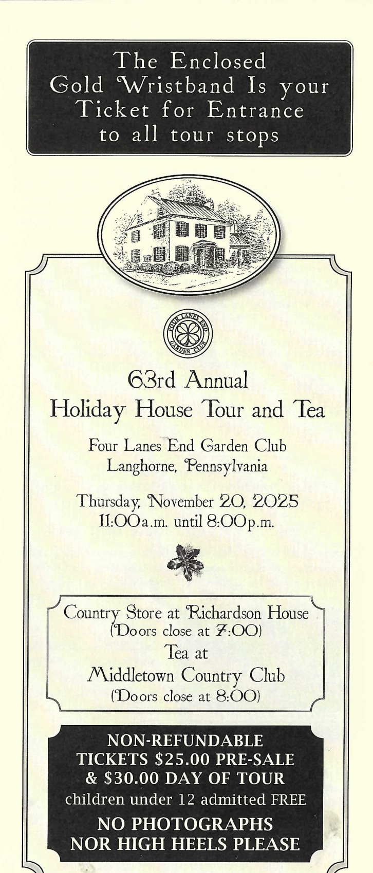 The Four Lanes End Garden Club is excited to announce that our 64th Annual Holiday House Tour & Tea will be held on November 19th, 2026.