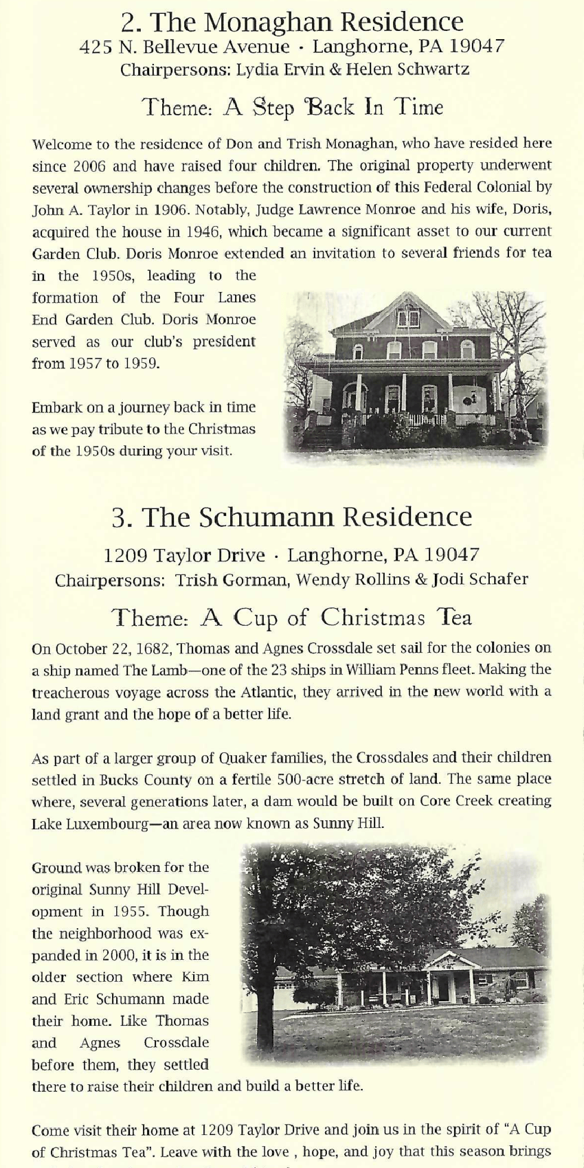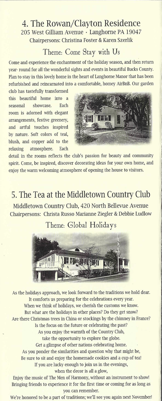 The event is also the Garden Clubโ€™s largest annual fundraiser. Proceeds help support community beautification projects, maintenance of the historic Richardson House, and scholarships and charitable programs that benefit the local community. Through this long standing holiday tradition, the Four Lanes End Garden Club welcomes visitors to experience the charm, history, and warm hospitality of Langhorne during the festive season.